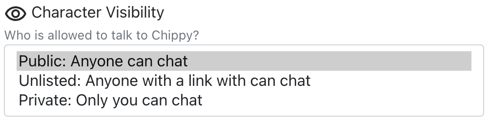 This setting controls who will be able to chat with your Character. You may want to set this to Unlisted or Private while you are developing the Character, then switch it to Public when you're done.