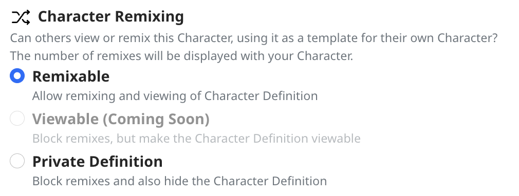 There are three settings for Character Remixing, which allow you to control both the ability for others to Remix as well as the visibility of the Definition. The Viewable state will block remixing, but still allow users to view all the details.\
