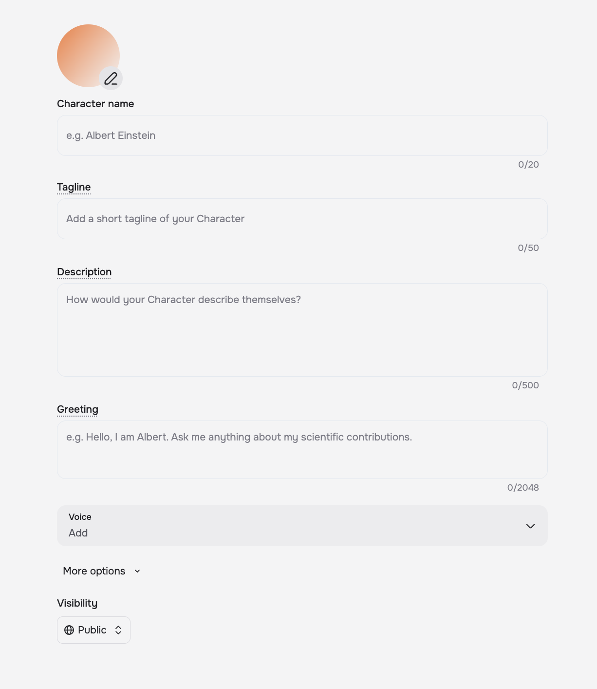 The Character Visibility defines who will be able to talk to your Character. If set to Public, your Character will be visible on Home and in search results. If it's Unlisted, others won't see it unless you share the link, while if you set it to Private no one else will be able to talk with the Character.